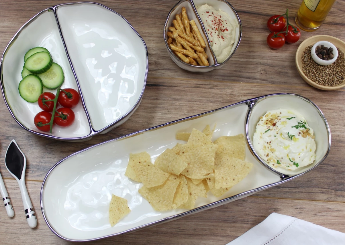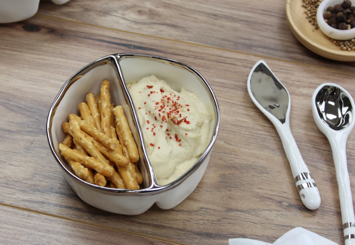 Great for serving your favorite pairs! Think small candies and nuts, dried fruit and chocolate, mustard and ketchup! Gleaming white porcelain with luxurious silver rim. Food safe, dishwasher safe, oven safe to 550°. Easy Care.