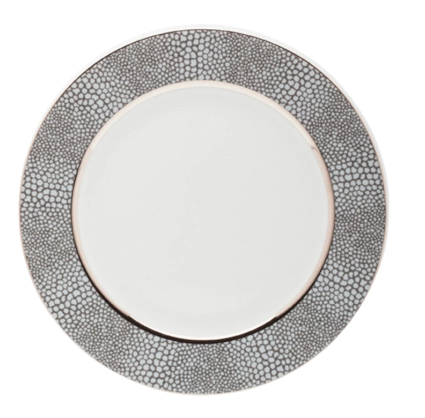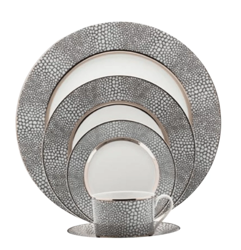 Hand painted platinum filet on classic white Limoges porcelain showcases Royal Limoges distinct craftsmanship. The Recamier shape takes on a contemporary flair with Makassar, rendering elegant sharkskin in gray and platinum. Handmade in France since 1797.