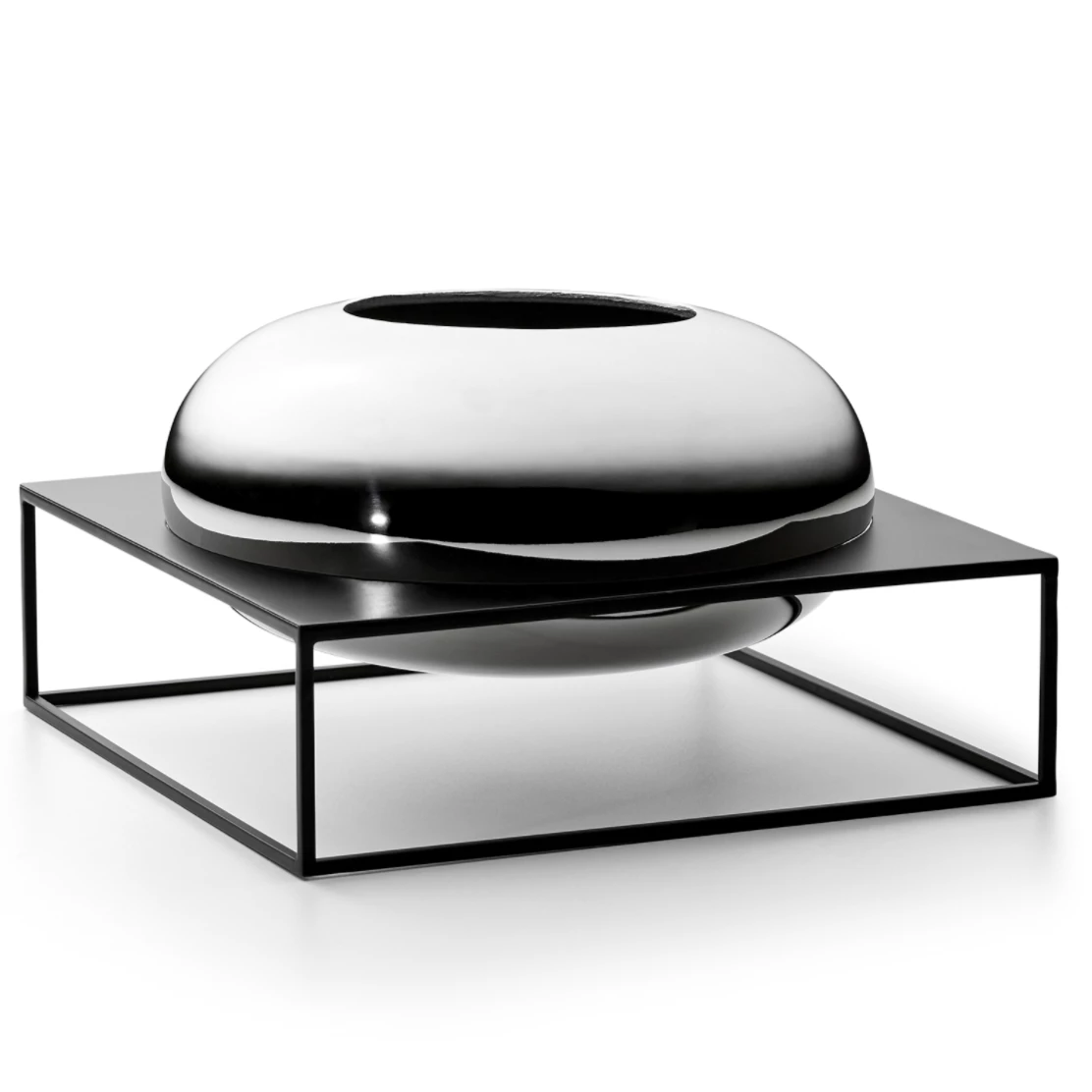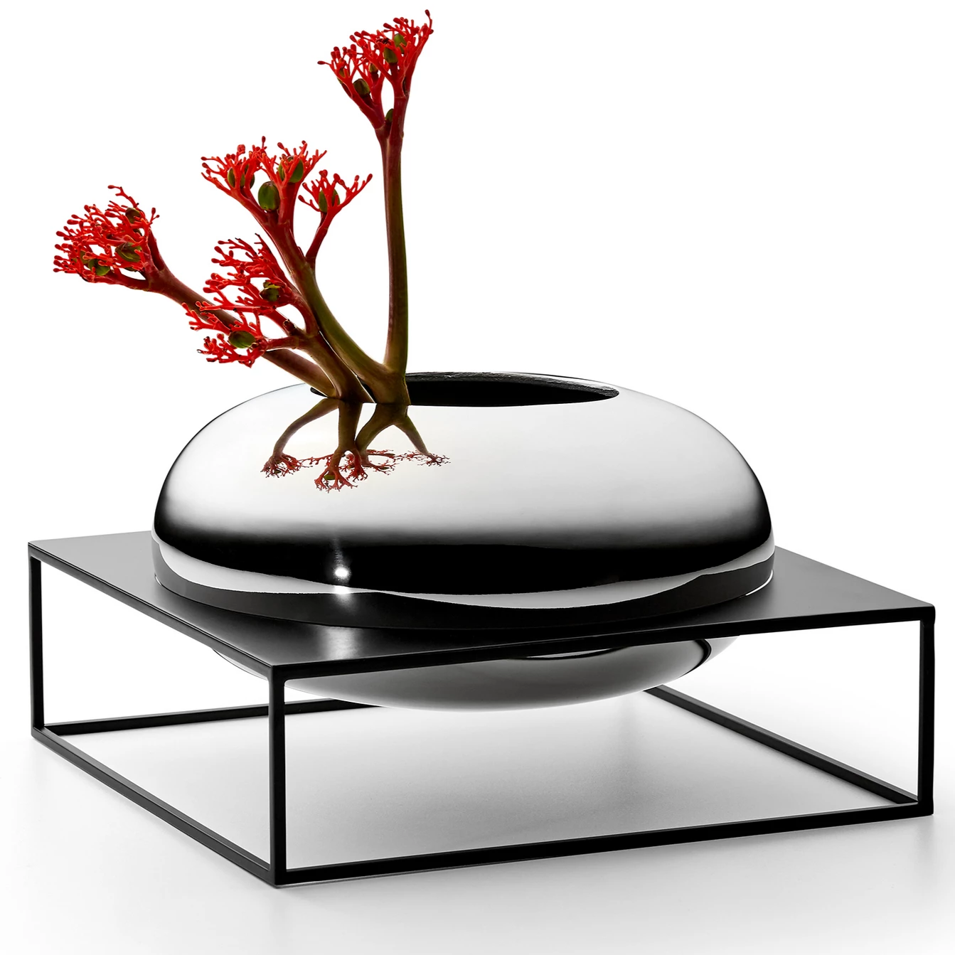 The Solero vase has soft organic curves and seems to float on the powder coated steel base. The high polished vase is watertight to hold flowers and these can be paired together to create a striking tablescape or used alone as decor.Â