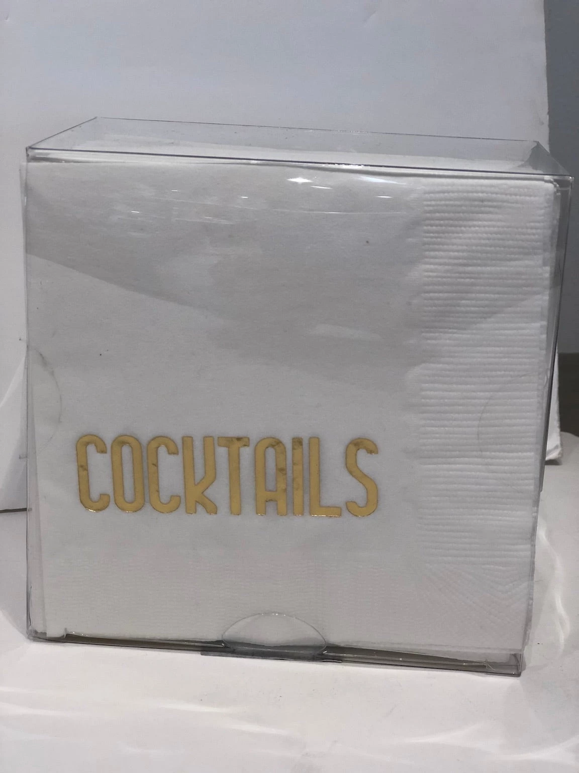 - 60 white cocktail napkins with gold foil lettering