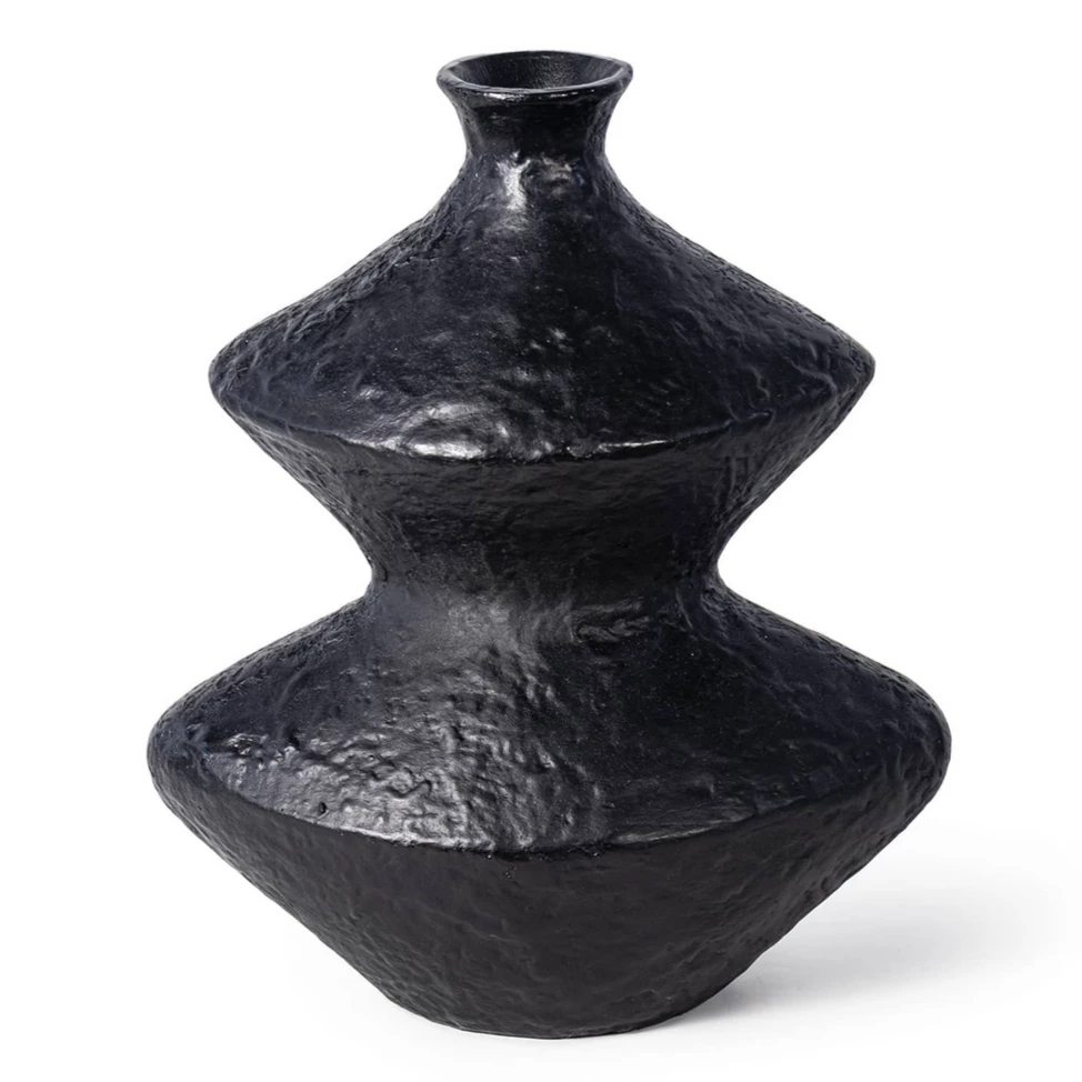 This vase has a mottled texture that gives it a handmade artisan look. The blackened plaster finish mixed with a sculptural silhouette makes it easy to use with other pieces or as decor on a console or shelving unit.