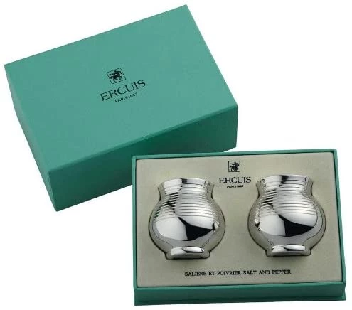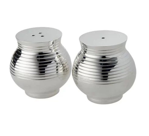 Silver-plated salt and pepper shakers with ribbed texture add elegance to any table setting.
