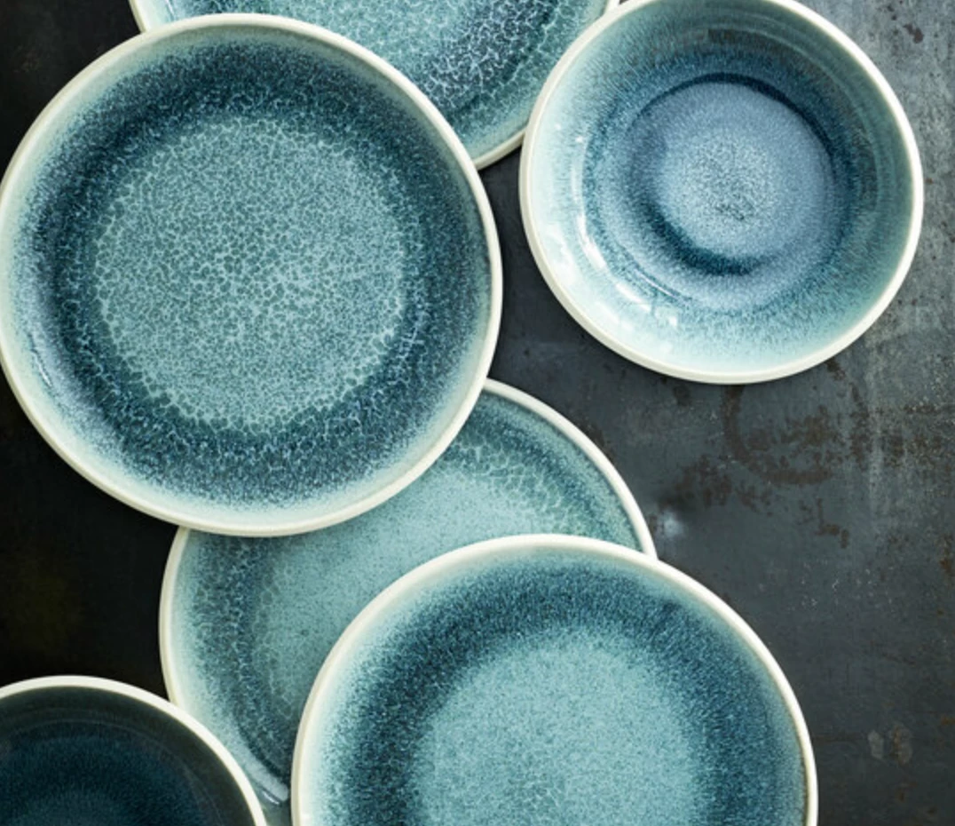 Junto Aquamarine offers a vibrant, earthy stoneware collection with a special reactive glaze. The charm of this unusual glaze lies in the unique appearance of each item. The edges in particular show up through a thinner layer of glaze with a semigloss, dark sheen, and unmistakable speckled structures appear on the ceramic surface with certain shapes.