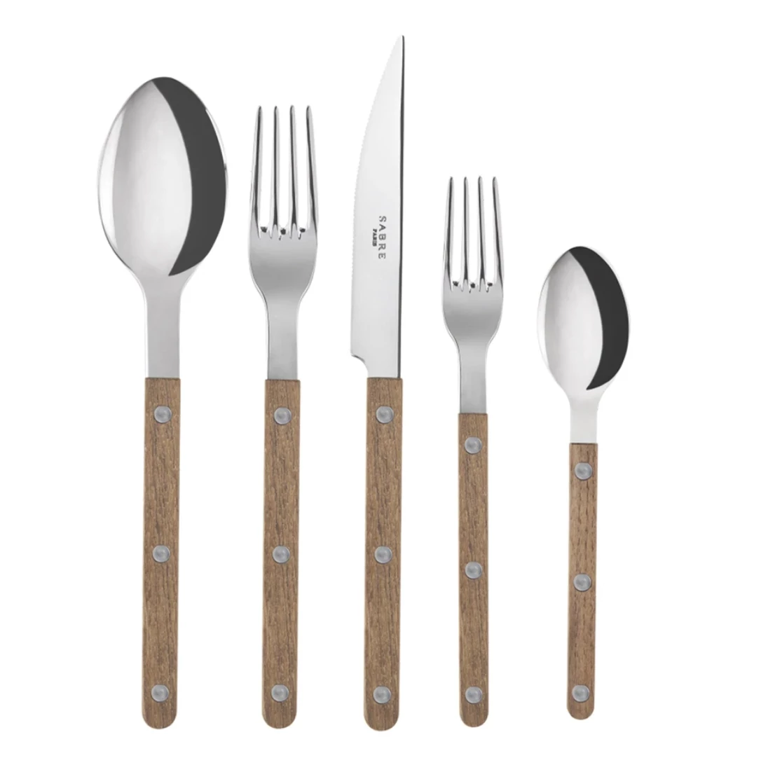 The Teak Bistro flatware collection offer a modern, fun twist on a traditional style. This French-made cutlery collection from Sabre. Their stainless steel/carbon alloy is custom-crafted to stay shiny, while the teak wood handles add a textural, natural element to your table.