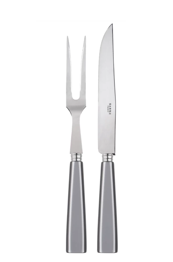 A Current Home Favorite, the Natura Flatware & Serveware Collection, with its sleek combination of acrylic and stainless steel, brings a modern aesthetic to the table. Composed of a large knife with a sharpened blade and a serving fork, the Natura Carving Set is very effective for carving poultry or other meat.