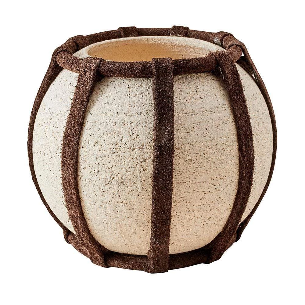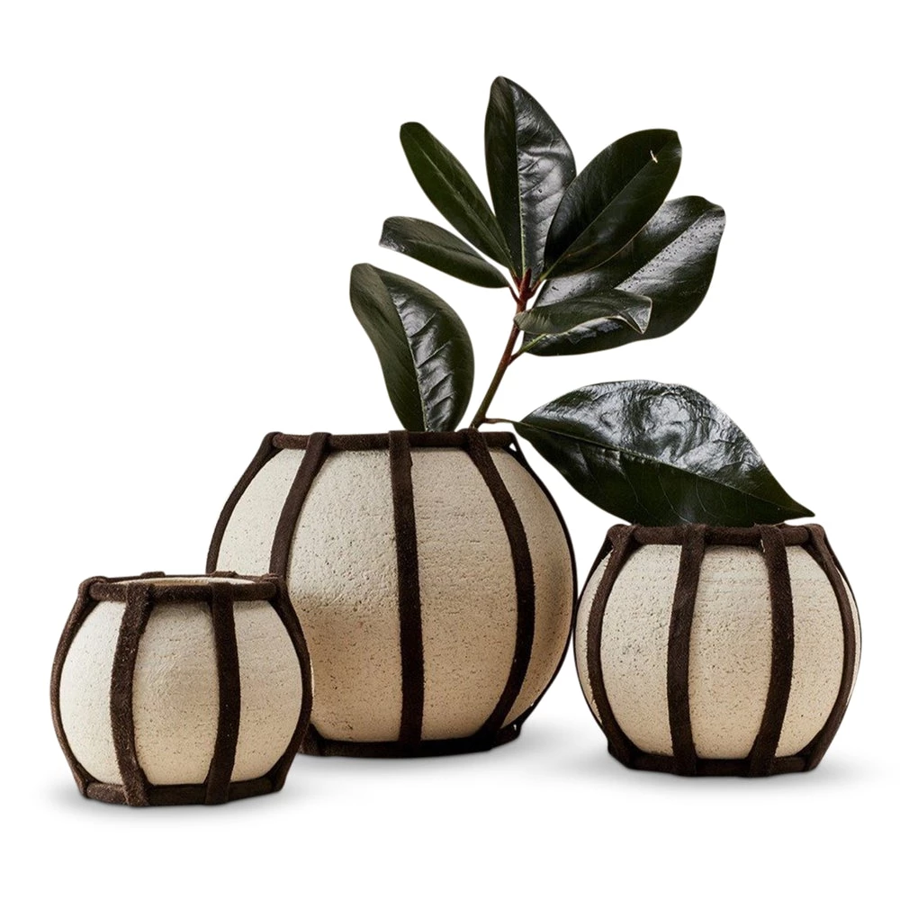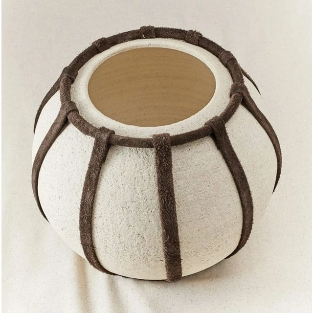 These suede-wrapped vases may be beautiful as a flower pot or a place to stash your sunglasses, as a sculpture or interesting enough to stand on its own.