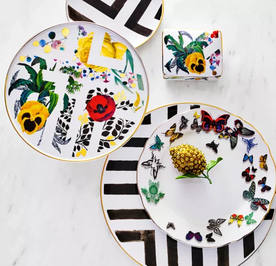 In celebration of the partnership between Christian Lacroix and prestigious porcelain makers, Vista Alegre, these whimsical dessert plates are adorned with magenta dahlias, crimson poppies, and buttercup yellow pansies that mingle with lush vegetation and immaculate stripes.Â