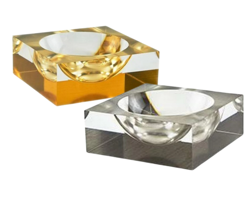 This lucite bowl in silver & clear is modern art. Perfect to as a candy dish, jewelry catchall or as decor on a cocktail table. This modern acrylic block captures the eye. and has a molded gold block of lucite making it a stunning table top accessory. Mix or match them, available in two colors