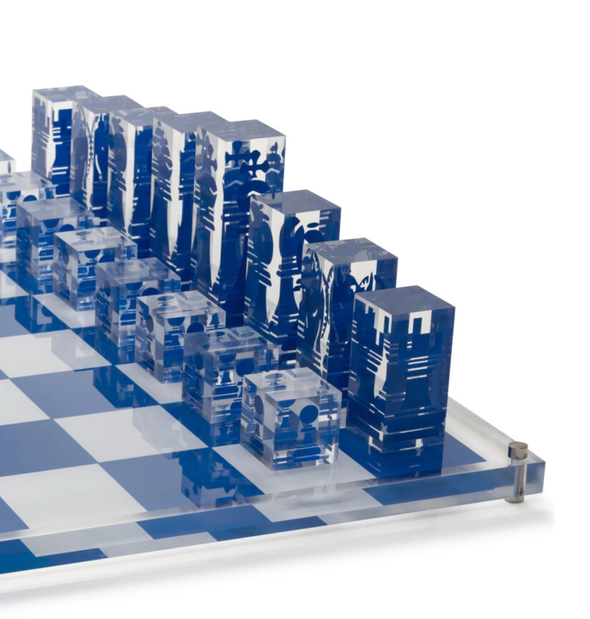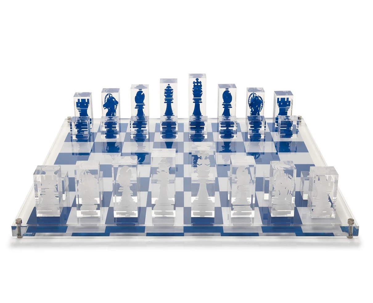 Fit for a Queen or King! Our new chess set is made of the finest luxury materials and has excellent craftsmanship. Each piece has its own inner qualities and is truly unique in design. Solid acrylic board with screen-printed playing pieces in dark blue and white.