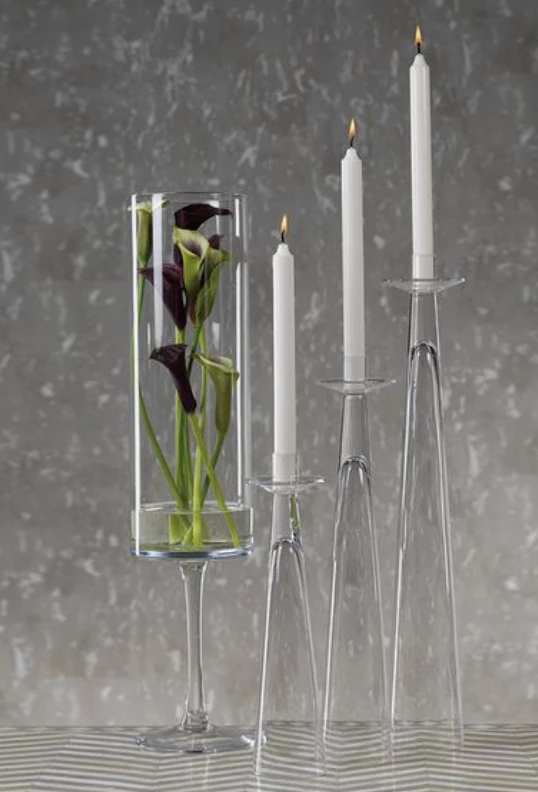These candleholders are the perfect piece to elevate your table setting! Ranging in heights they work well grouped together and the clear glass does not obstruct the person across from you