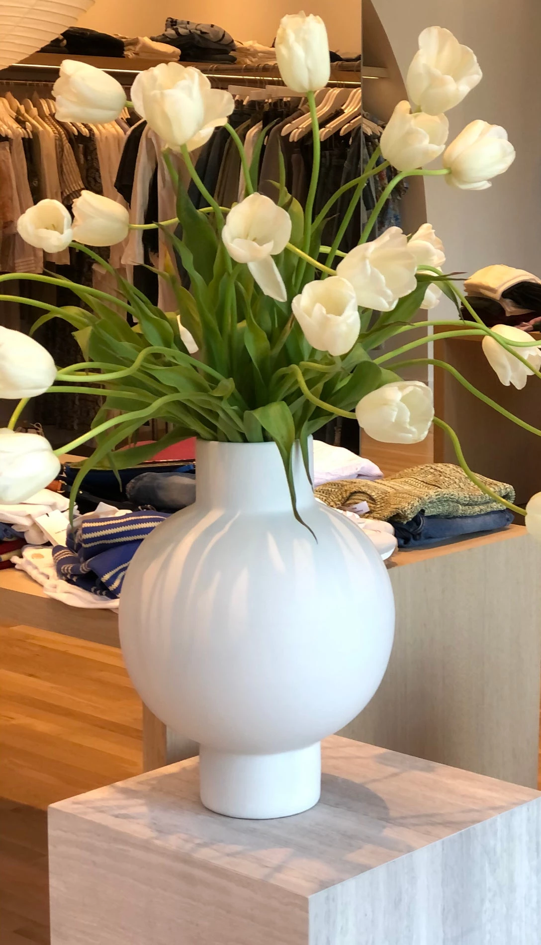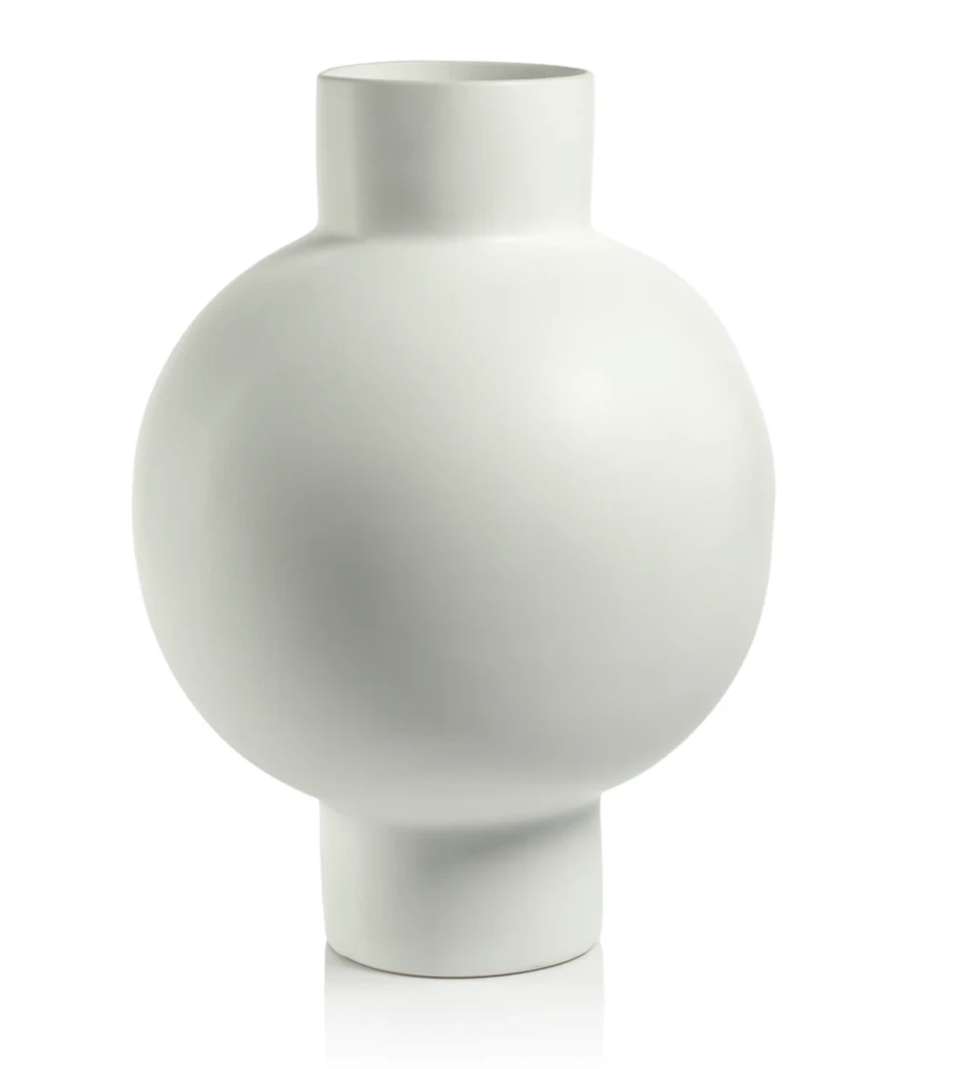 The crisp white vase is raised on a pedestal base and it is a large piece that makes a statement.  Watertight for flowers.